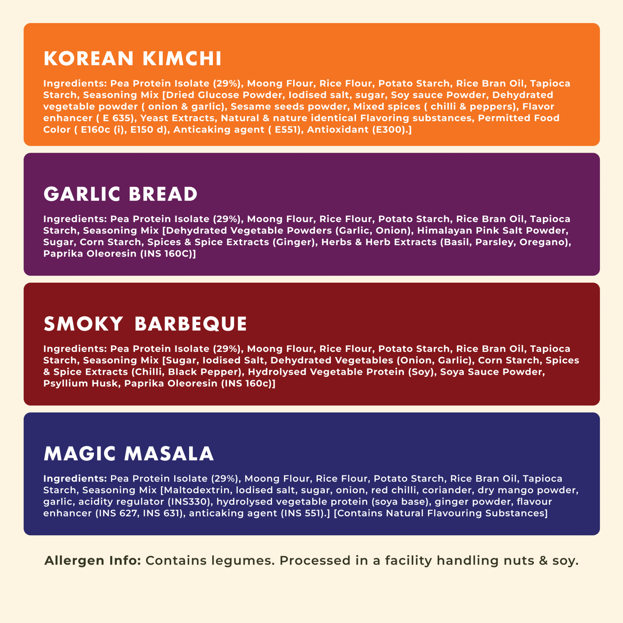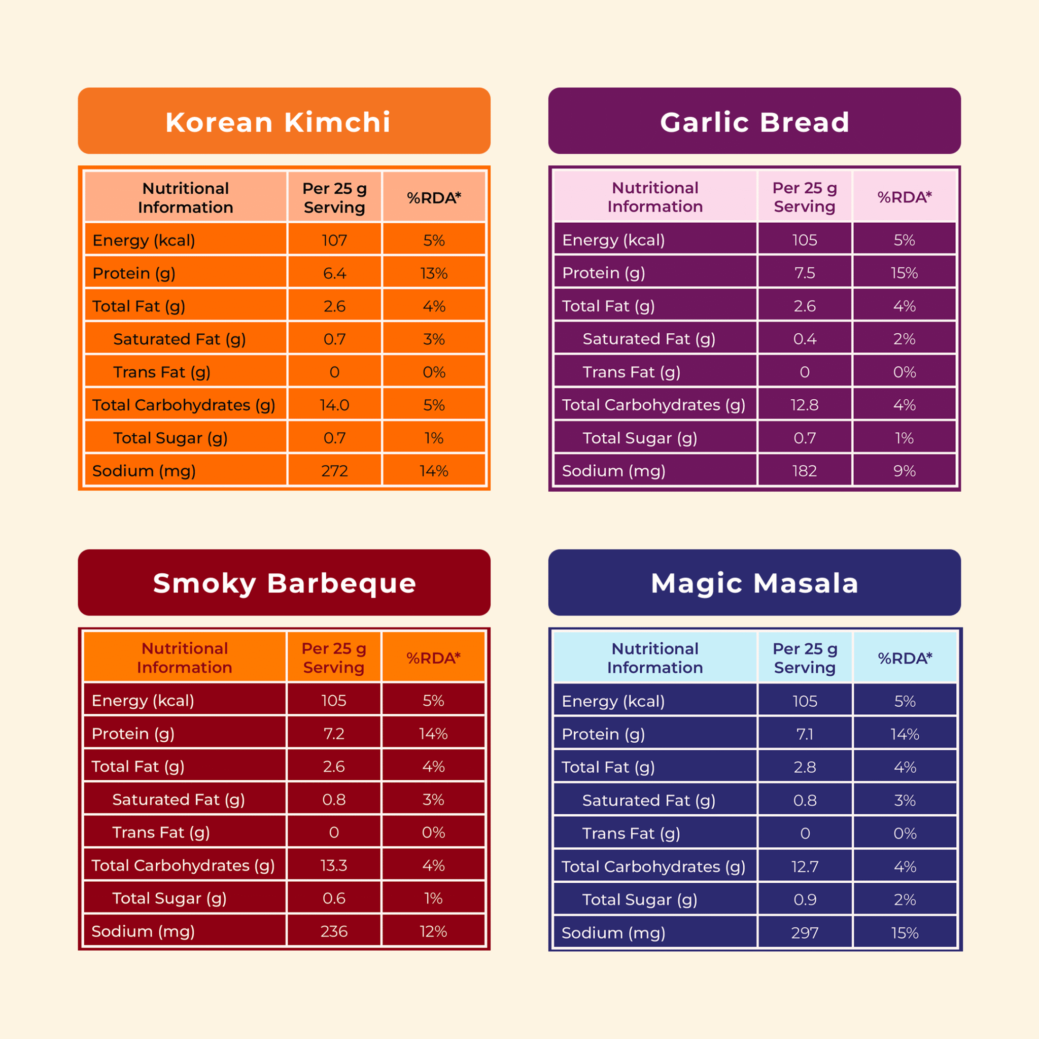 Pack Includes 2 × Barbeque Smokey (25 g each)2 × Korean Kimchi (25 g each)2 × Garlic Bread (25 g each) × Magic Masala (25g each)